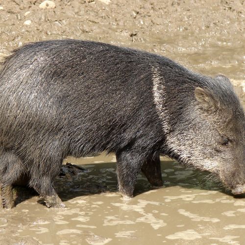 Beskrivning: Upp till 25 kg kroppsvikt, längd upp till 100 cm utan svans (5 cm). Höjd upp till 50 cm. Mörkbrun till svart päls med en vit halsbandsliknande märkning på sidorna och främre kroppen. Kraftigt utvecklade hörntänder, dock mindre än hos de europeiska vildsvinen.