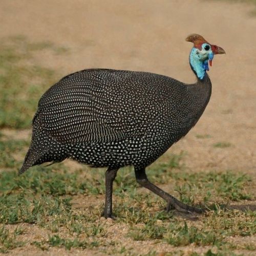 Beskrivning: Det är den mest berömda och utbredda viltlevande fågeln i Sydafrika. Den är i storlek som en kyckling, svart/grå med fina vita prickar och ett blåaktigt huvud och en färgrik hals. De lever i flockar upp till 500 fåglar eller mer, samt jagas särskilt i jordbruksområden.