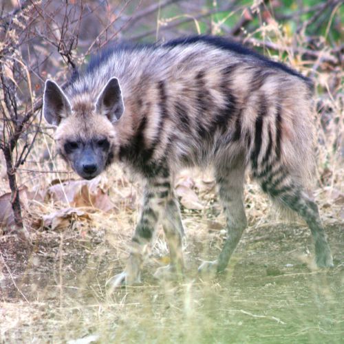Beskrivning: Relativt långa ben och har på sidorna vertikala mörka strimmor och en förhållandevis lång man på nacken. Benen är strimmiga och huvudet är typiskt hyenalikt med kraftiga käkar. Kroppsvikt upp till 55 kg, längd, utan svans (35 cm) 120 cm och mankhöjd upp till 80 cm.