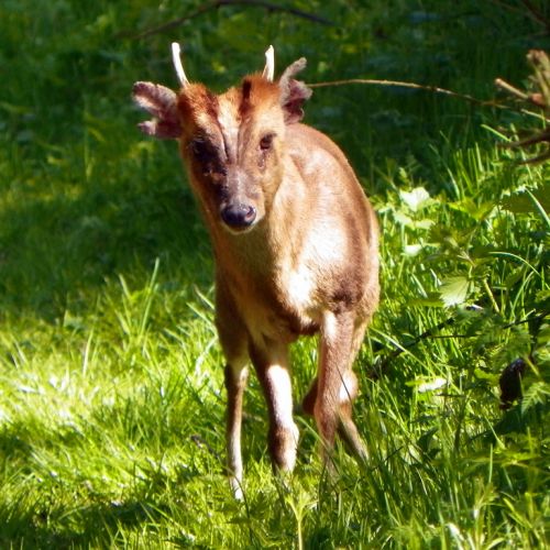 Beskrivning: Äkta muntjak, liten hjort som väger upp till 12 kg med en mankhöjd på max 46 cm och en kroppslängd utan svans på 85 cm. Sommardräkten är rödbrun och vinterdräkten gråbrun. Karaktäristisk mörkbrun ansiktsmask. Muntjaken har höga rosenstockar varifrån oansenliga horn växer upp. Hos hanarna är hörntänderna i överkäken kraftigt förlängda.