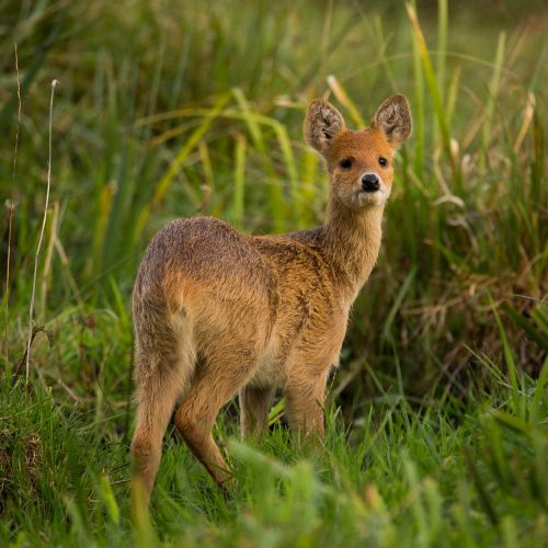 Beskrivning: Liten hjort med kroppsvikter på max 15 kg, en höjd på ca 55 cm. Grundfärgen är gulbrun på sommaren och gråbrun på vintern. Vattenrådjuret har inga horn, men har långa synliga hörntänder i överkäken.