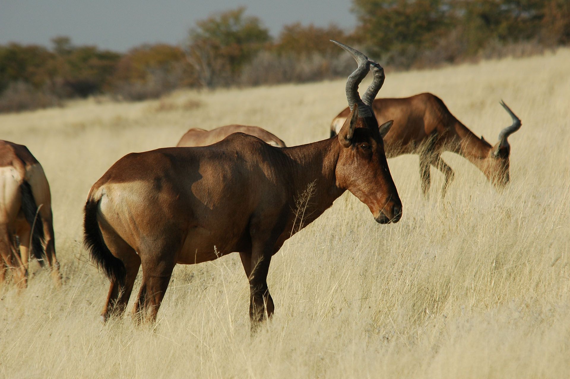 Beskrivning: Mellanstor antilop som väger omkring 170 kg och mäter 120-140 cm över manken. Skinnfärgen är ljust brun. Hornen är kraftiga med djupa tvärgående spår, startar i en lyrform men istället för att gå inåt böjs hornen vinkelrätt bakåt längs ryggen där lyran är som bredast. Detta ger dem ett mycket speciellt utseende. Hornens krumning är dock inte lika markanta som hos Red Hartebeest och Western Hartebeest.