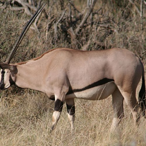 Beskrivning: Stor antilop med mycket kompakt kropp. Färgen är beige med den för oryxantiloper så kända markeringen längs buken och på huvudet.