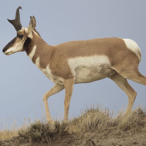 Beskrivning: Antilopliknande klövdjur med vikter upp till 70 kg, mankhöjd på ca 100 cm och en längd upp till 150 cm. Skinnet har en blekt beigebrun färg, mage och det nedersta på benen är vitt, vit spegel, vit strupe och halsfläckar. Bruna fläckar på kinder och över ögat. Mörk nosrygg, ljusa sidor på huvudet. Honen böjer sig lite inåt dock med framåtriktade spetsar. Säreget är att hornens skarphet varje år bryts av pannflikarna och sedan växer ut på nytt.
