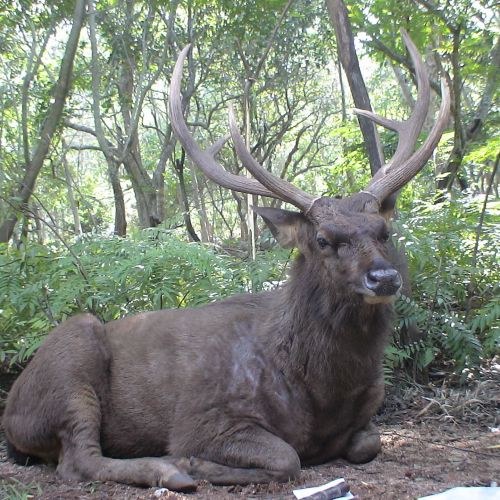 Beskrivning: Mycket stor hjortart med kroppsvikter på upp till 350 kg, mankhöjder på upp till 150 cm och en kroppslängd, utan svans (20 cm), på upp till 250 cm. Den mycket kraftiga hornuppsättningen får sällan mer än sex taggar. Pälsen är i regel mörkbrun.