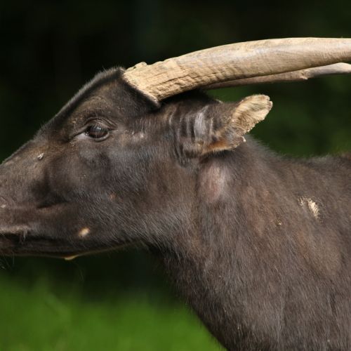 Beskrivning: Liten vildoxe, brunsvart med bakåtböjda horn. Kroppsvikt upptill 200 kg. Längd utan svans (25 cm) ca 150 cm. Mankhöjd ca 70 cm.