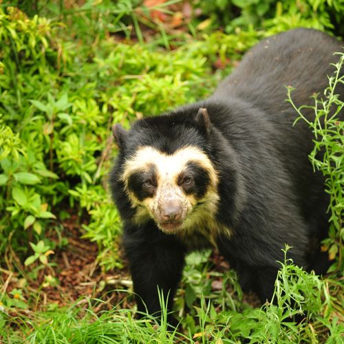 Beskrivning: Upptill 200 kg tung björn som har svar päls och en karakteristisk vit glasögonliknande teckning i huvudet. Mankhöjd 90 cm, kroppslängd ca 2,1 m.