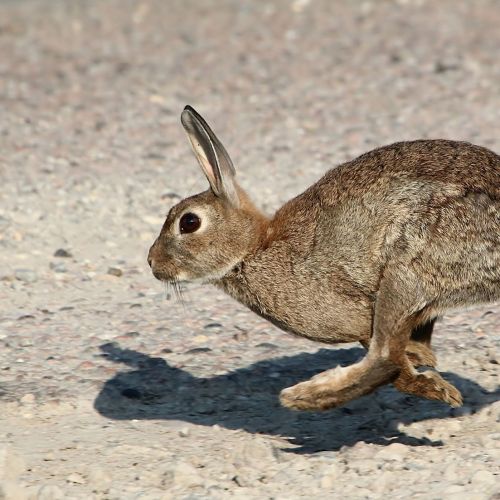 Beskrivning: Litet gråbrunt däggdjur med långa öron, långa bakben och fötter samt kort mjuk svans.