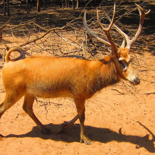 Beskrivning: Stor hjortart med vikter på upp till 300 kg och en mankhöjd på 125 cm. Grundfärgen är gråbrun hela året. Hornen är kraftiga och oregelbundna. Efter rosenstocken delar hornen upp sig i två mycket långa stänger där det bara finns spetsar på den främre.