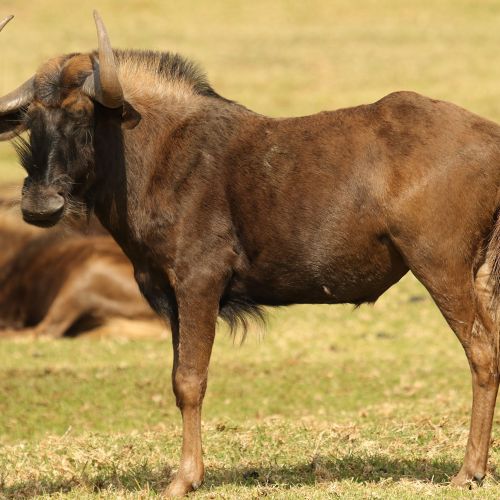 Beskrivning: Mellanstort djur av gnufamiljen med en vikt på 150-170 kg och en höjd av 120 cm. Färgen är svartbrun, och som namnet antyder – har den en vit svans. Karaktäristiskt är att den har en stor hårrosett på mulen samt mycket hög borstig man som ofta ger en falsk indikation om djurets höjd.