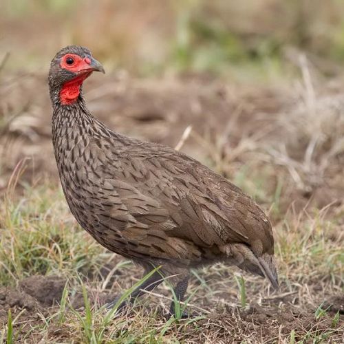Beskrivning: Den är brun med ett karakteristiskt rött huvud, och är en mycket eftertraktad fågel att jaga, för den är kraftig och snabbflygande. Den påminner om Cape francolin, men de lever inte i samma områden. De förekommer oftast i mindre flockar om 8-10 fåglar.