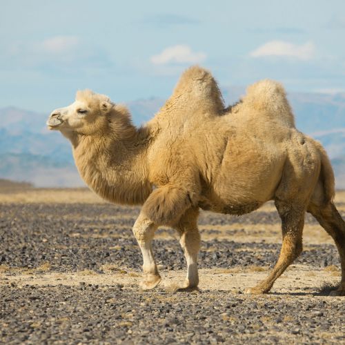 Beskrivning: Största representanten från kamelfamiljen. Kroppsvikt, upp till 700 kg. Längd, nästan 300 cm. Mankhöjd, 210 cm. I motsats till dromedaren har vildkamelen två pucklar. Pälsen är tjock och ullig och färgen varierar från ljusbrun till mörkbrun. Domesticeringen fastslås till ca 2 500 f.Kr.