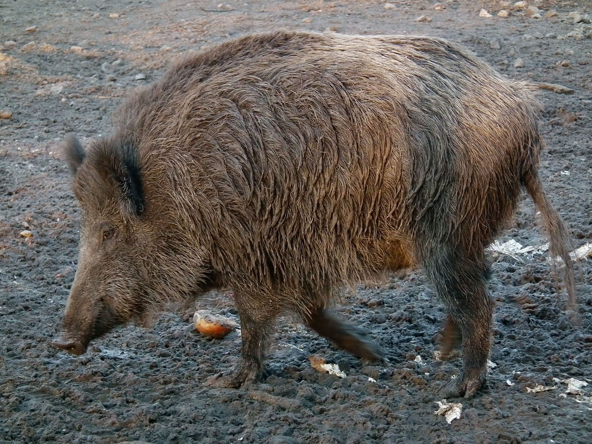 Beskrivning: Stort svin med kompakt kropp och relativt korta ben. Pälsfärgen är svartbrun med delvis gråaktiga partier. Borsten är delade i ändarna. Grisarna är från början randiga, senare mörkgrå till rödaktigt bruna. Hörntänderna växer hela livet och är längst hos galten. Vikt upp till 350 kg vid en längd på 180 cm och en mankhöjd på 120 cm.