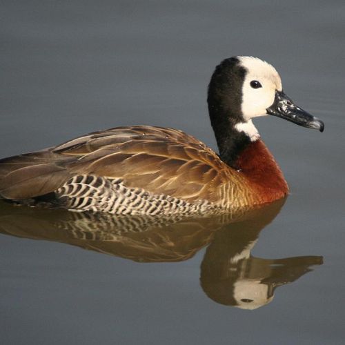 Beskrivning: Whitefaced duck har en rödbrun kropp med gråaktiga vingar. Den har en svart hals och ett långt vitt huvud, som gett den dess namn. Det är en välflygande fågel.